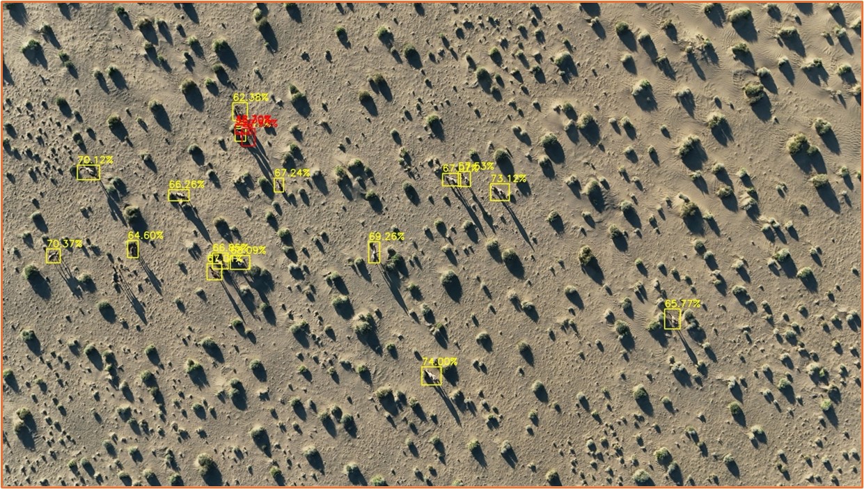In our research in Mongolia's Gobi Desert, YOLOv8 achieved over 90% accuracy in detecting Bactrian camels from drone imagery. (McCarthy et al., 2025) (Figure 1 a, b). Across landscapes the model provided consistent processing and high precision in wildlife detection. Once trained to identify camels the model processed 63,000 images per hour, far beyond human capacity. For an endangered desert species, the enhanced monitoring provides early warning of population changes. Findings significantly advance conservation monitoring for camels and wildlife in remote ecosystems, tracking population dynamics and shaping conservation strategies in challenging habitats.