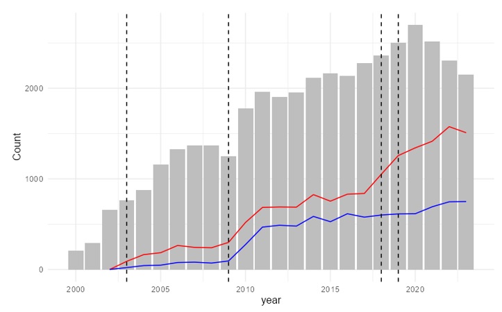 Note: Grey histogram indicates the number of surveys for all land contamination. Red line indicates the number of mandatory surveys and blue line is the number of land contamination in legislation surveys. Source: “Result of a survey on the status of implementation of the soil contamination countermeasures act and cases of soil contamination investigation and countermeasures, etc.” (2025)