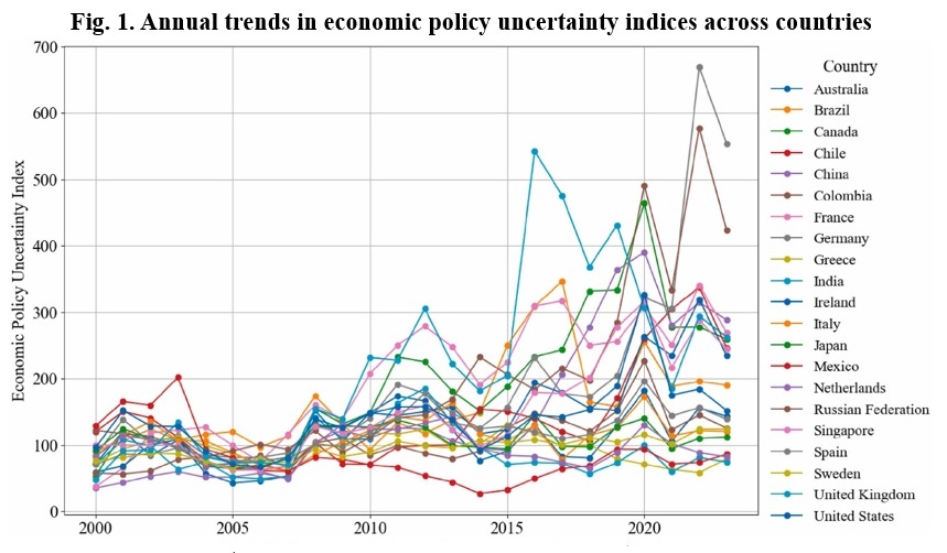 As shown in Fig. 1, the EPU indices in the 21 countries exhibit cyclical fluctuations, rising sharply during crises such as the 2008 financial crisis and the 2020 pandemic, and easing during recovery phases. These patterns underscore how shocks and policy shifts shape volatility.