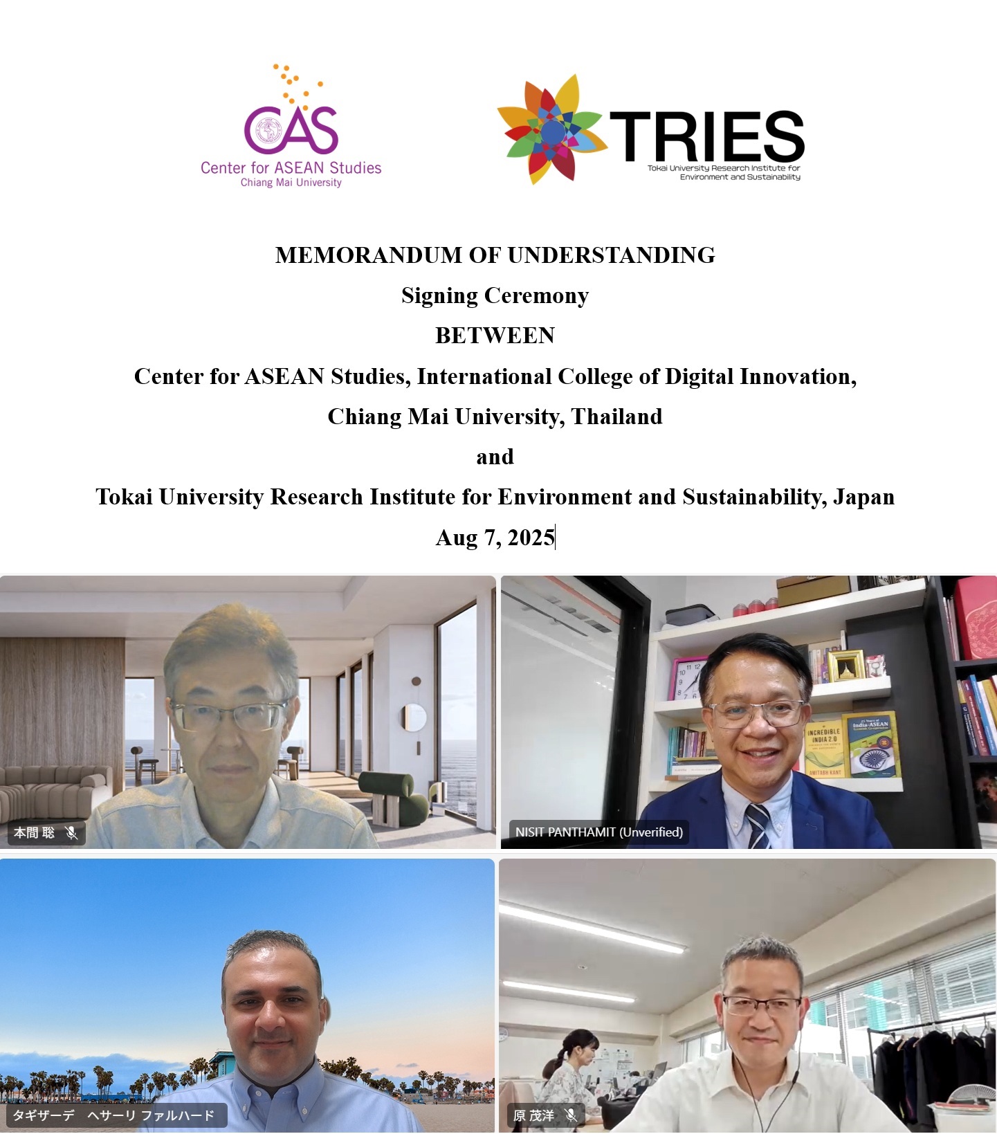 Date: August 7, 2025On August 7, 2025, the Tokai University Research Institute for Environment and Sustainability (TRIES), Japan, and the Center for ASEAN Studies (CAS), International College of Digital Innovation, Chiang Mai University, Thailand, signed a Memorandum of Understanding (MoU) in an online ceremony.
