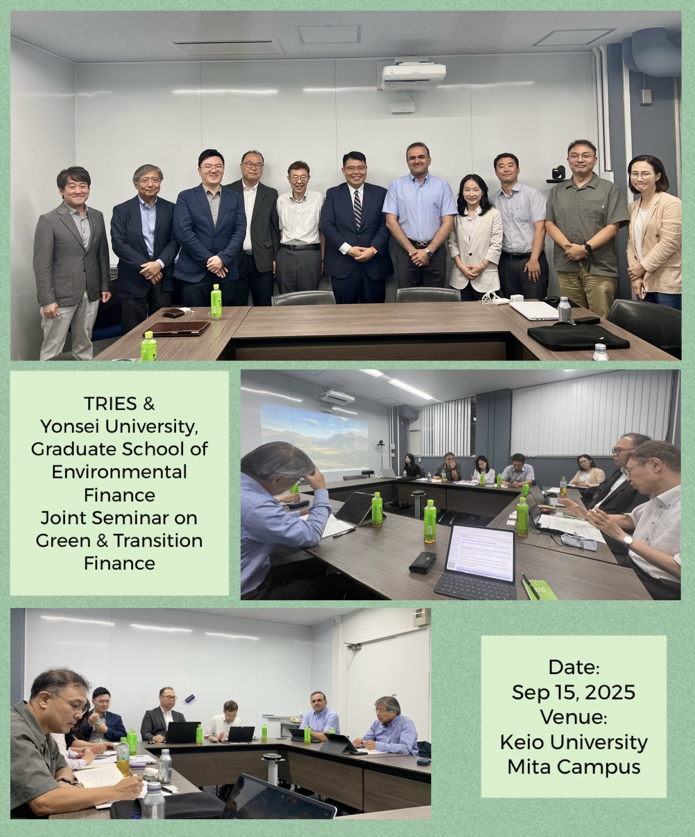 Date: September 15, 2025On September 15, the Joint Seminar on Green & Transition Finance was successfully held, co-organized by TRIES and the Yonsei University Graduate School of Environmental Finance at Keio University, Tokyo. The event opened with welcoming remarks from Prof. Satoshi Honma, Executive Director of TRIES, and Prof. Suk Hyun, Dean of the Graduate School of Environmental Finance at Yonsei University. Professors and Ph.D. candidates from Yonsei then presented papers on ESG disclosure and leadership transitions, transition risk and asset replacement, greenwashing recognition using LLM-based methodologies, governance of multilateral development banks, and the role of green bond issuance in environmental protection. The seminar concluded with constructive comments and active discussion by Prof. Toshiro Nishizawa (University of Tokyo), Dr. Farhad Taghizadeh-Hesary (TRIES), Prof. Satoshi Honma (TRIES), and Prof. Sangsoo Lee (Yonsei University). The event underscored the growing collaboration between the two institutions following the signing of their MOU.